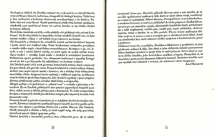 Kniha textů hrnčíře Jiřího Duchka, o hlíně, keramice a vůbec hledání významu a hloubky ve zdánlivě obyčejných činnostech a věcech