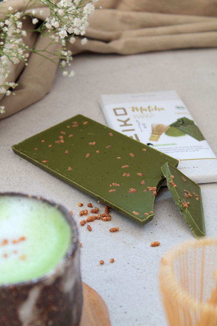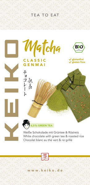 V čokoládě jsou použity pouze ty nejlepší, Fair Trade organické kakaové boby Grand Cru, vysoce kvalitní organický surový třtinový cukr, bio sušené plnotučné mléko a samozřejmě nejlepší zelený čaj KEIKO a pražená rýže. Tyto vynikající komponenty jsou s láskou ručně přetvořeny do čisté a poctivé čokolády. Protože méně je často více: čokoláda je bez lecitinu, lepku, cizích tuků a umělých příchutí.