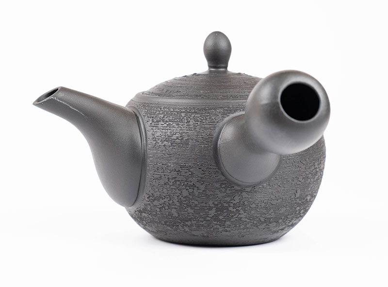 Tmavá kjúsú s keramickým sítkem od umělce Ninsui z Tokoname. Víčko a tělo konvičky zdobeno jemnou texturou.