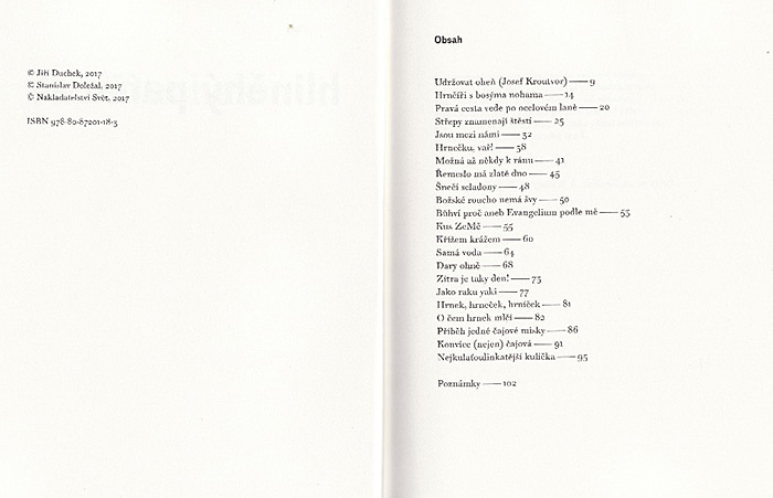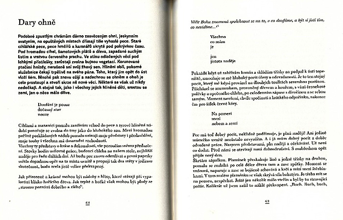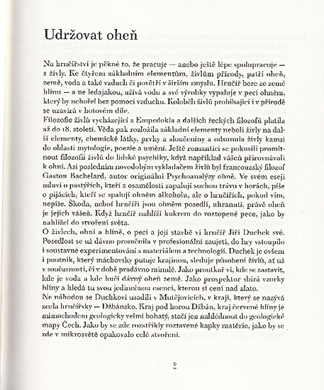 Kniha textů hrnčíře Jiřího Duchka, o hlíně, keramice a vůbec hledání významu a hloubky ve zdánlivě obyčejných činnostech a věcech