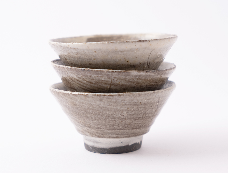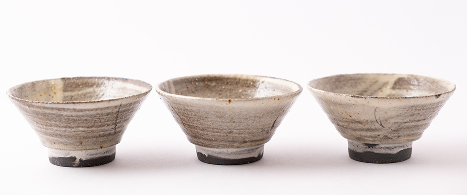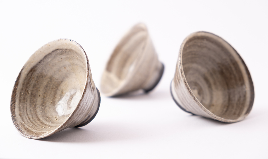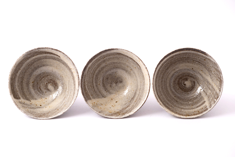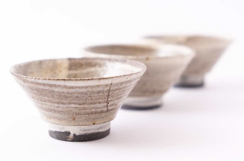 Kamenina točená na kruhu, páleno při teplotě 1200ᵒC. Pod glazurou je štětcem nanesená bílá engoba, styl inspirovaný korejským Buncheongem.