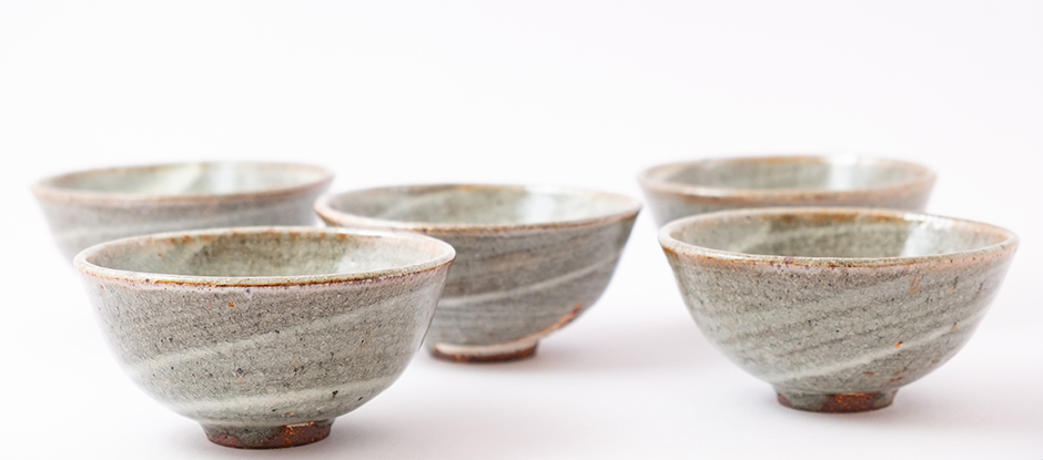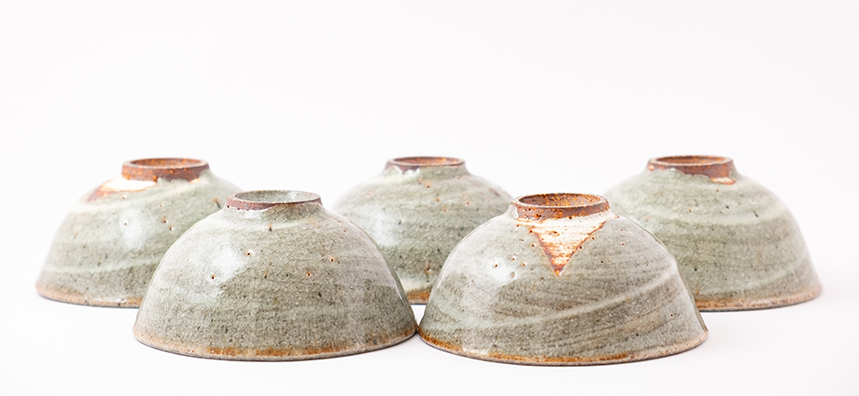 Stoneware fired in a wood-fired kiln at a temperature of approximately 1300°C. Buncheong glaze — dark clay is coated with white kaolin, which is then overglazed with a transparent glaze.